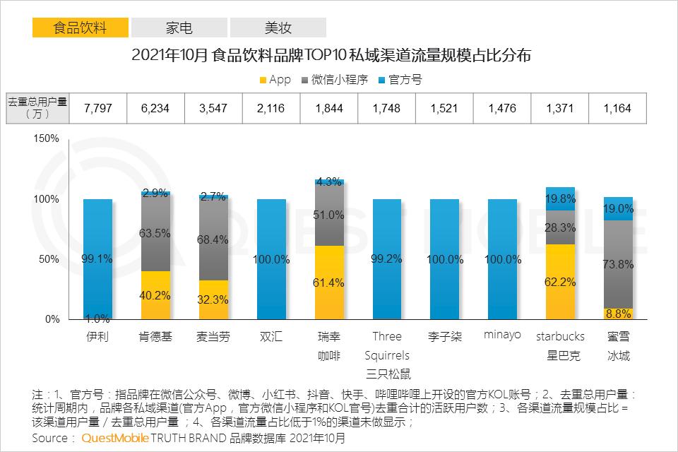 1、食品饮料领域,规模化生产的食品饮料品牌更加依赖品牌营销传播,KOL官方号成为重点布局渠道;依托线下门店服务场景品牌则加重在APP、小程序端的流量布局