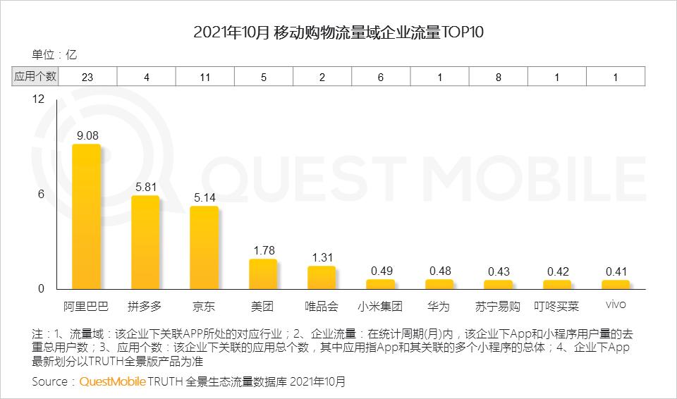 2.1 移动购物行业,阿里巴巴投入应用数量与收获流量成正比,拼多多及京东位列二三位,美团凭借社区团购类应用的布局,收获近2亿流量