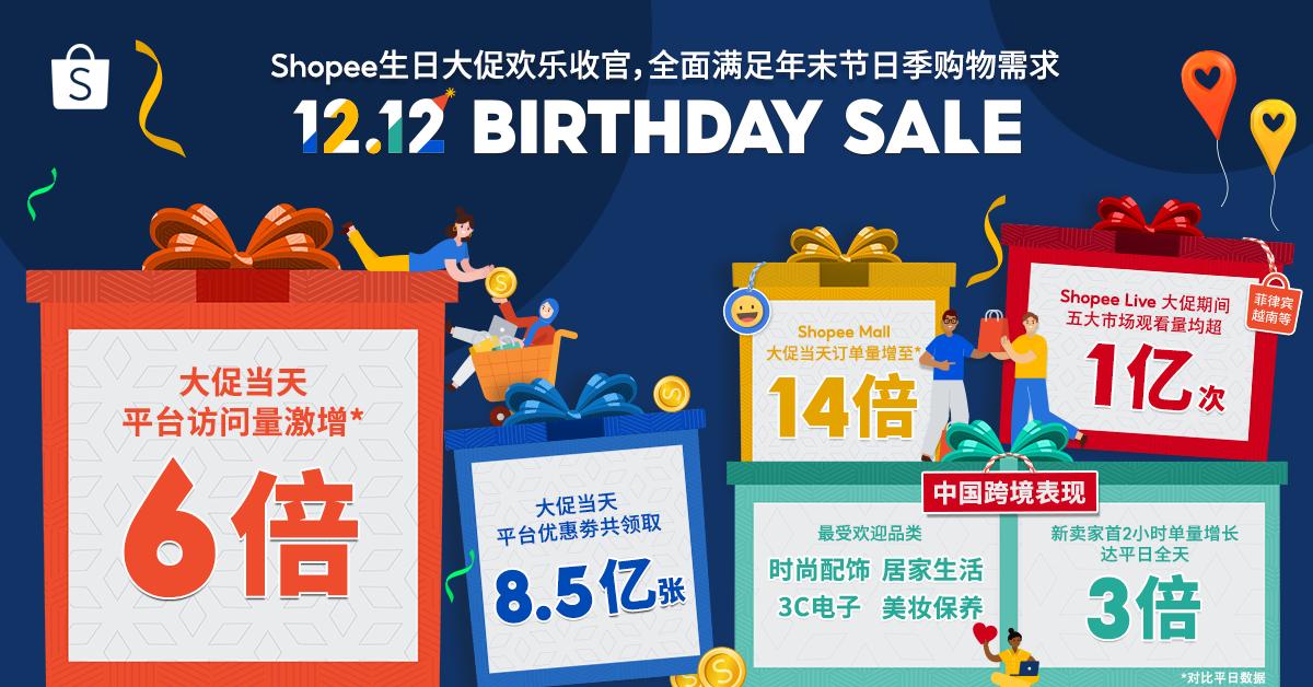 2021 年 12 月 14 日,中国——知名电商平台 Shopee 宣布,年终欢乐庆典12.12生日大促圆满落幕:大促当天,平台访问量激增至平日6倍,超8.5亿张平台优惠券被东南亚消费者们收入囊中,时尚配饰、居家生活、3C电子及美妆保养为最受欢迎跨境品类。