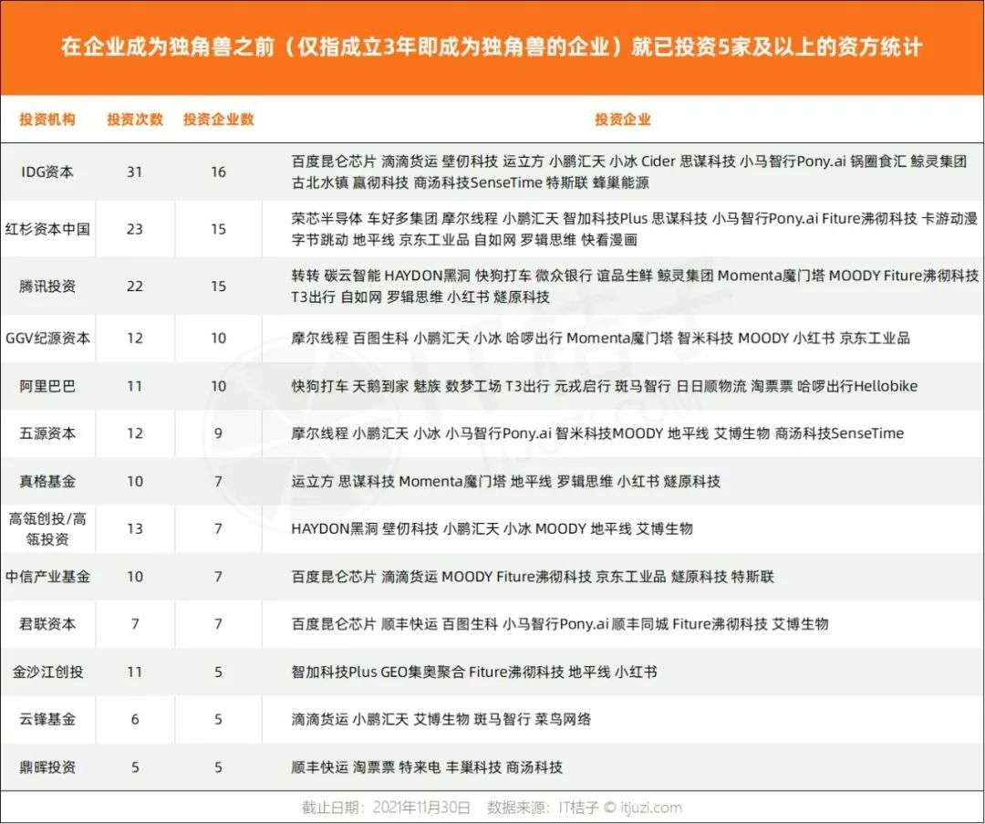 据 IT 桔子统计,在成立 3 年即成为独角兽的 72 家企业样本中,包括 IDG 资本、红杉资本中国、腾讯投资在内不少明星资本,在企业成为独角兽之前就已投资至少 5 家企业。