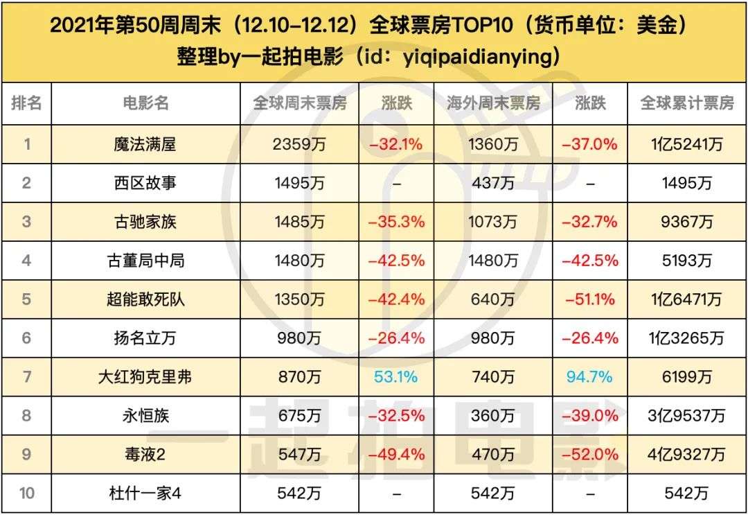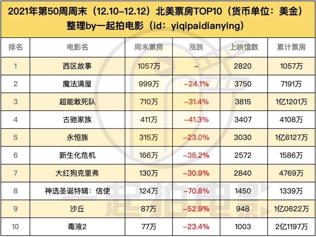 史蒂文·斯皮尔伯格的歌舞片《西区故事》票房表现不太理想,几乎在所有市场都低于映前预测。实际上本片不止影评人评分它的观众口碑也不错,其中CS观众评分为A,PostTrak推荐指数为4.5星88%观众给出正面评价,但看起来并未转化为票房能力。北美3天仅有1057万美元大幅度低于1500万的映前保守预测,业内普遍不看好他能有看齐2002年《芝加哥》1.71亿美元的表现。海外在37个市场收入440万美元,但仅在英国以129.8万英镑拿下唯一一个周末冠军,甚至有12个市场未进周末前五。