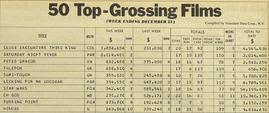 尽管接下来将会迎来大片挤占市场,但拥有口碑优势又有奥斯卡加成的《西区故事》也并非没有机会收回1亿美元成本。44年前的12月《周末夜狂热》与史蒂文·斯皮尔伯格经典科幻片《第三类接触》在美国同周大规模公映,尽管《第三类接触》连续拿下7个周末冠军并劲收7700万美元片租收入(折合1.25亿美元票房),但《周末夜狂热》也凭借后劲毫不逊色的获得了7146万美元片租收入(折合1.31亿美元票房),并籍此开启了约翰·特拉沃尔塔传奇的电影演员生涯。在历史上圣诞前两周发行对女性有较强吸引力的音乐剧并非明智之选,正常来说应当放在圣诞当周。但是这两周时间也许会让影片的高品质通过口耳相传扩散,在圣诞假期里带来惊喜。