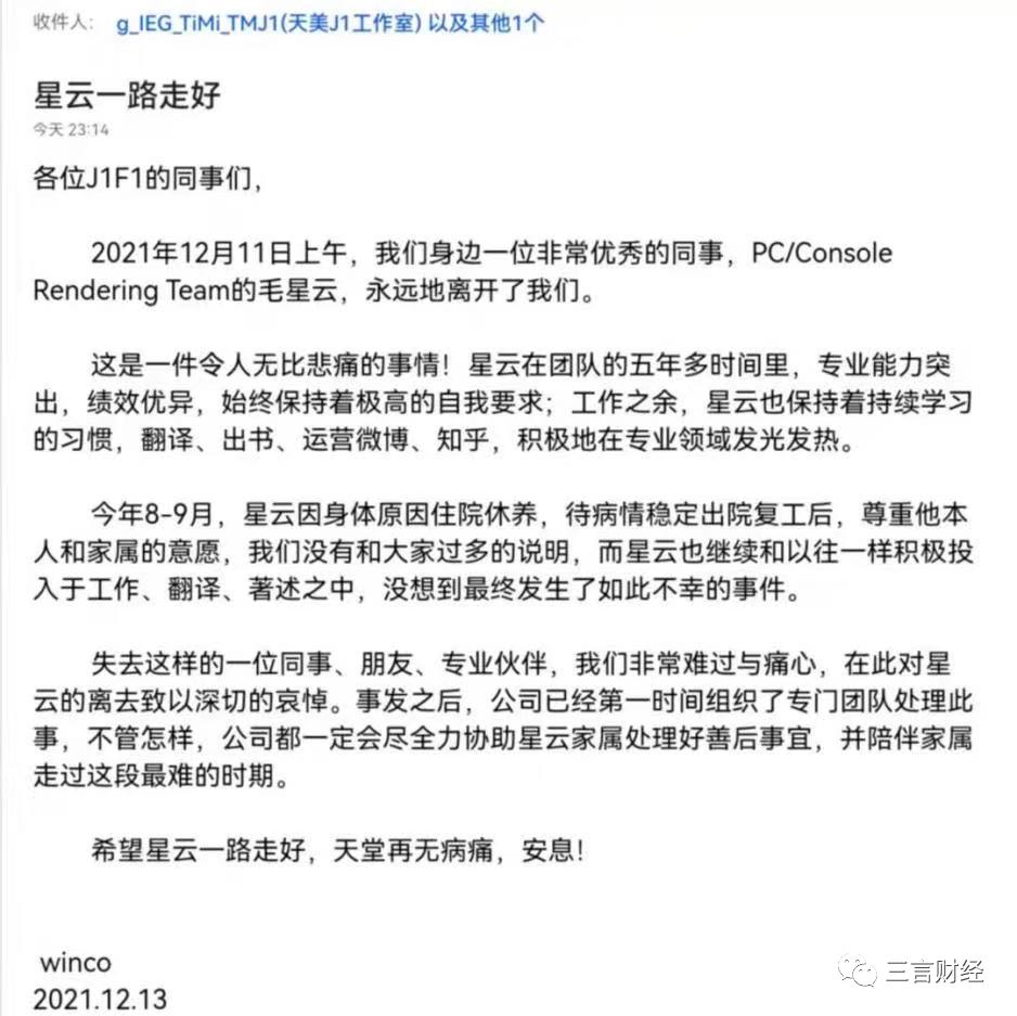 腾讯也在内部邮件中表示,“失去这样一位同事、朋友、专业伙伴,我们非常难过与痛心,在此对星云的离去致以深切的哀悼”。