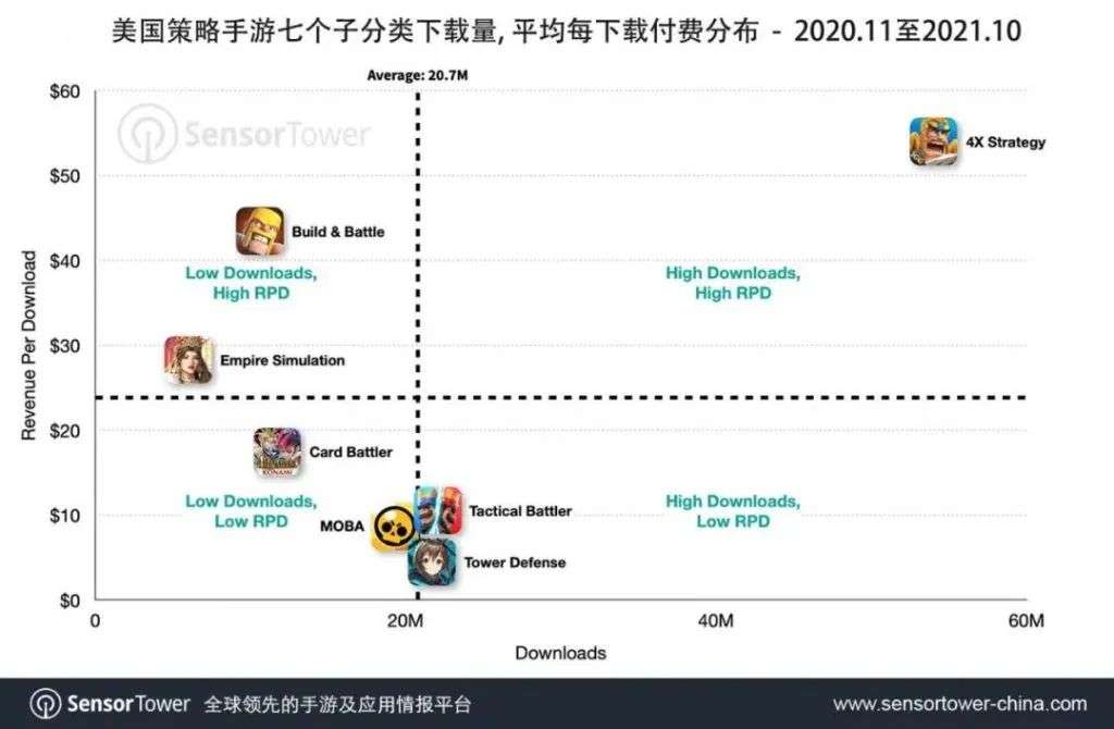 过去一年,策略手游作为美国App Store和Google Play收入可观的手游分类,收入仅次于解谜和博彩。4X策略手游(SLG)作为该品类的收入引擎,贡献了当中三分之二的收入,同时也是下载量最高的子分类。