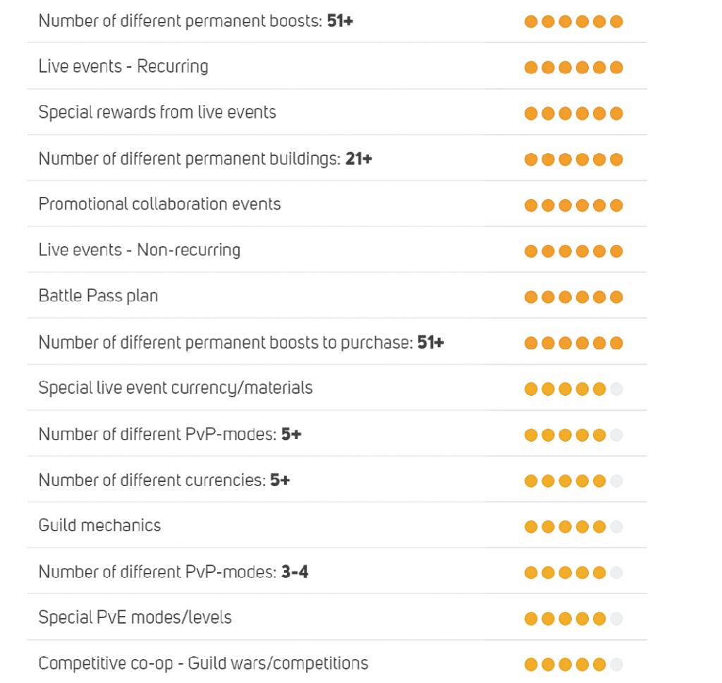 首先是长期进程循环,包括搭配不同类型的永久增益/加成(例如科技树)、训练/升级部队、建造/升级建筑等功能,通常还有多种货币的丰富/深度经济。从用户参与度和变现角度看,“有不断变强的可能性”是大多数策略游戏的主要原则,这一点在占策略游戏主体的SLG中尤为明显。