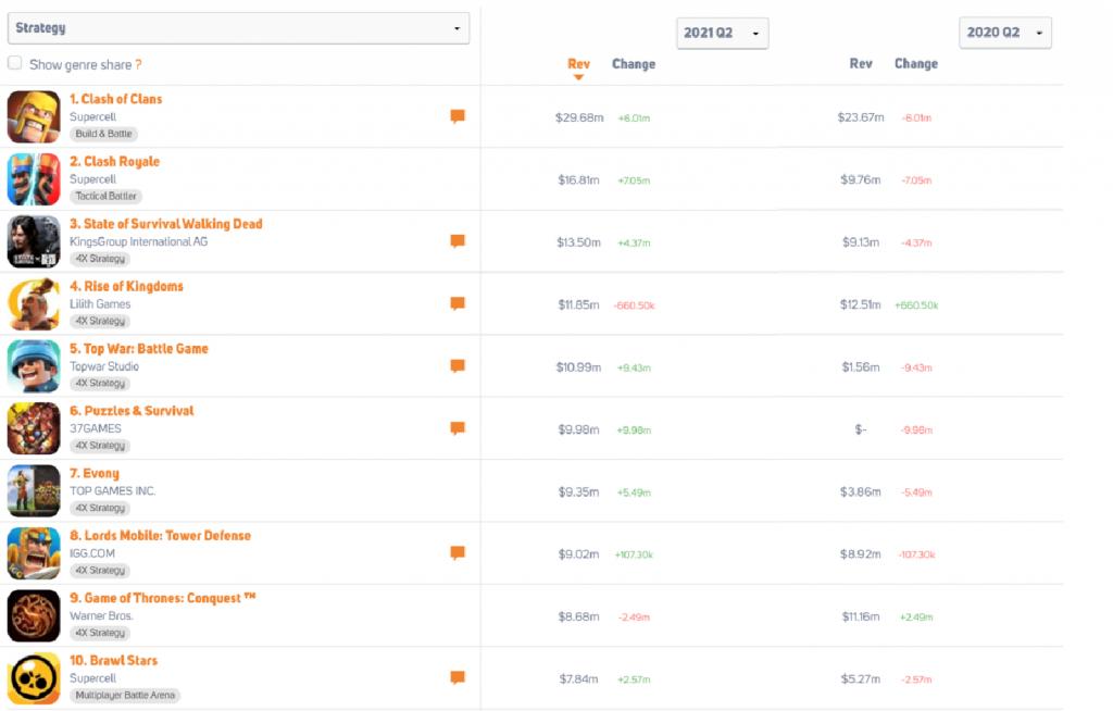 从具体的游戏产品来看,2020年11月至2021年10月期间,在美国市场收入最高的策略手游是IGG旗下SLG手游《王国纪元》,总收入达到3.3亿美元。其次是Supercell建造和战斗策略手游《部落冲突》,及FunPlus旗下SLG手游《State of Survival》。