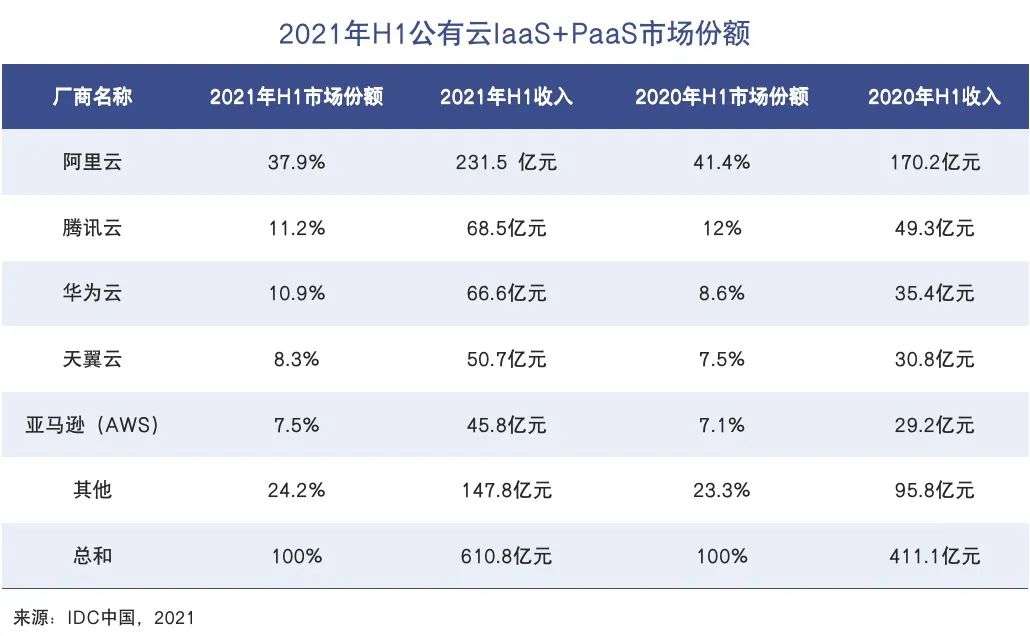 IDC发布的《中国公有云服务市场(2021上半年)跟踪》报告显示,截止到2021年上半年,中国公有云服务整体市场规模(IaaS/PaaS/SaaS)达到123.1亿美元(787.6亿人民币)。其中IaaS市场同比增长47.5%,PaaS市场同比增长53.9%。