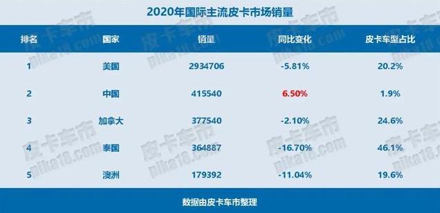 数据显示,2020年全球汽车销量为7803万辆,其中美国市场在2020年产生的皮卡销量为2934706辆,皮卡车型在美国汽车市场的占比高达20.2%。事实上中国作为全球最大的汽车市场市场,我国的皮卡销量仅次于美国。