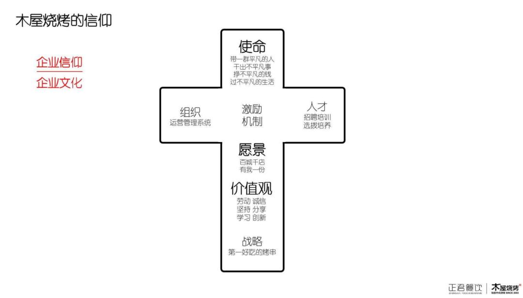 在“十字架”的解读中,从纵向来看,木屋烧烤的使命是“带一群平凡的人,干出不平凡的事,过不平凡的生活”。愿景是从之前的“百城千店”调整为“百城千店,有我一份”。价值观强调的是“劳动、诚信、坚持、分享、学习以及创新”。