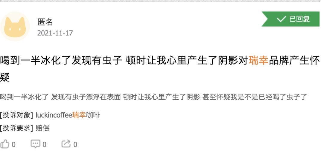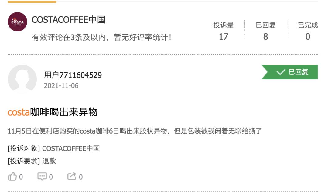 但对比多家咖啡品牌的投诉帖之后,我们发现,其他咖啡品牌中也有类似问题,比如瑞幸咖啡的投诉量达到了2465,CostaCoffee中国的投诉量17,也有消费者表示在这两家咖啡品牌中喝出虫子的问题。足以见得,食品安全问题其实是咖啡行业的通病。