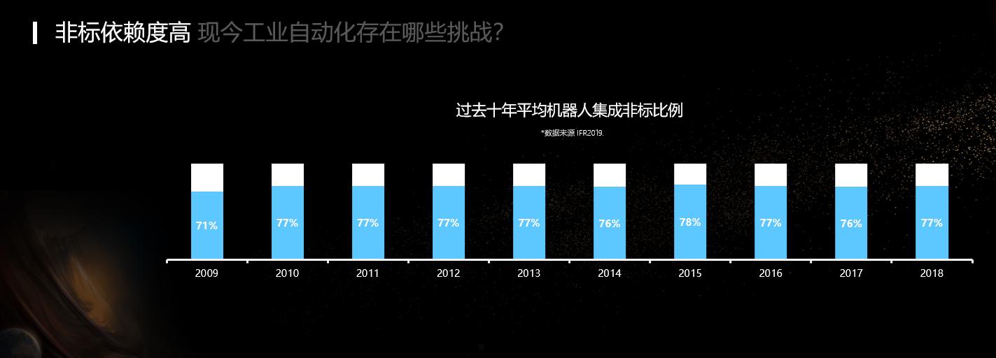 我们是怎么看这个问题的呢?其中一个直接原因,可以把它归根为,目前机器人解决方案对非标的依赖度比较高。