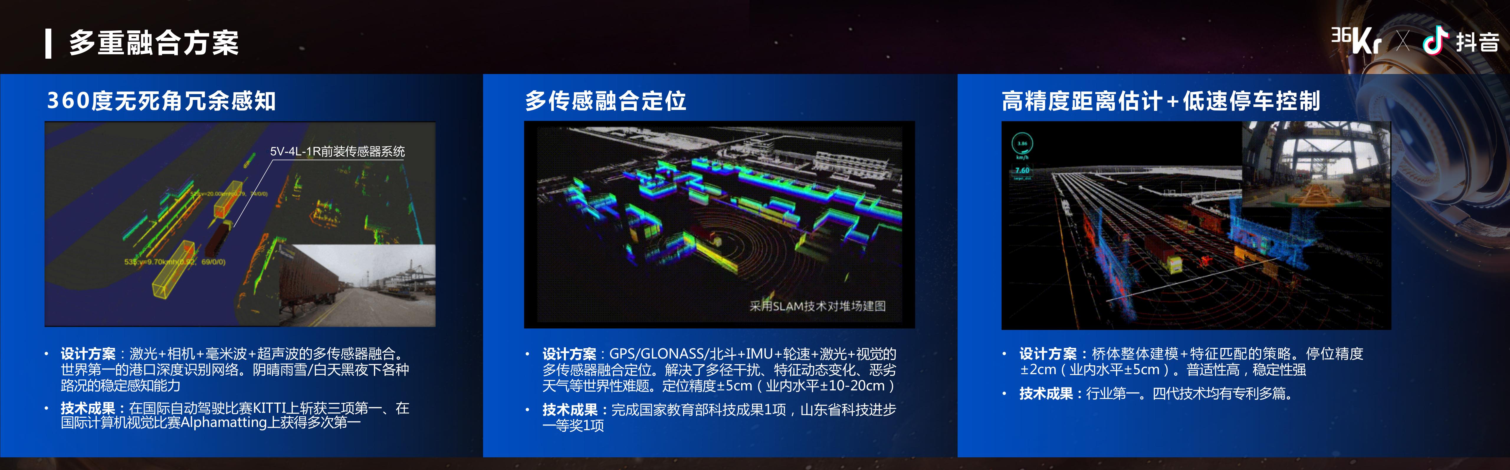 那斯年智驾的硬核科技在哪呢?首先从单车而言,我们的感知是一个360度无死角的覆盖,我们能够处理好动态变化,能够处理好白天晚上、阴晴雨雪等所有工况的通行。其次,我们既能够克服GPS、GLONASS,以及北斗这种遮挡和干扰的问题,又能克服在港口里面集装箱、桥、船这种动态变化带来的局部更新的问题。而且在精确对准上,我们申请了多项专利,在行业里面属于一个先驱者,而且也是一个领导者。