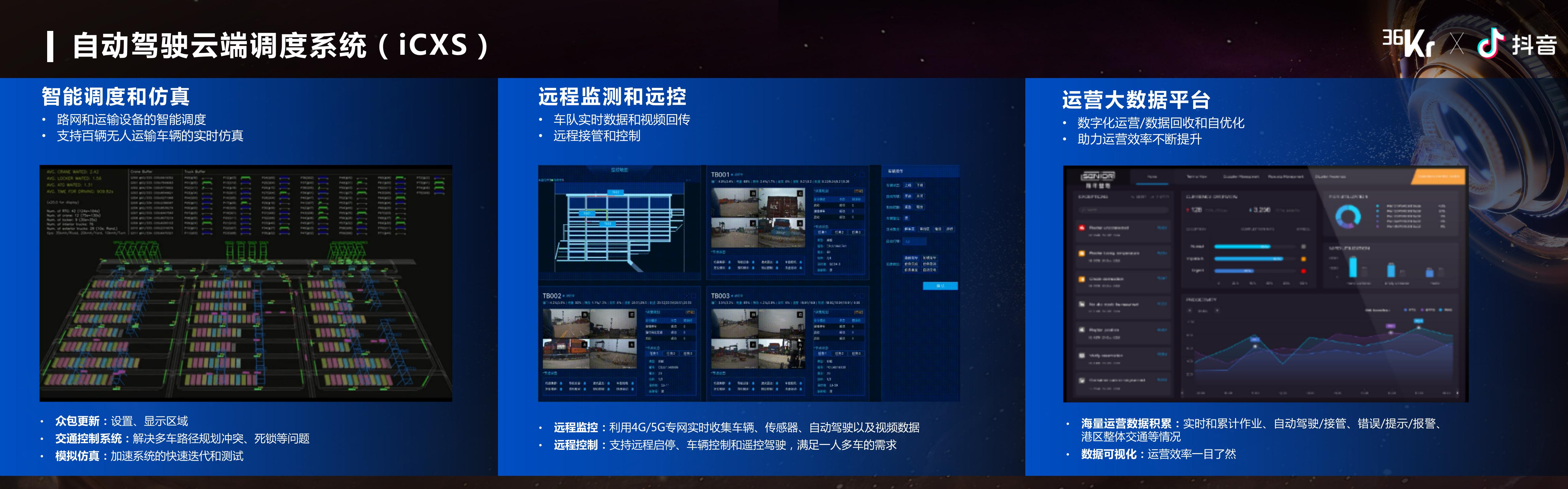 从云端而言,港口、矿山这种场景,是非常适合于车端、路端、云端结合的方式,所以在云端我们会做云端的调度、做云端的规划,利用4G、5G的专网搭建视频、自动驾驶数据、图像以及各种各样的车辆数据回收,并且当我们全部换成无人驾驶设备之后,我们未来还可以做更多的提升效率的事,降本增效这两个点都能在无人驾驶的泛港口领域得到体现。