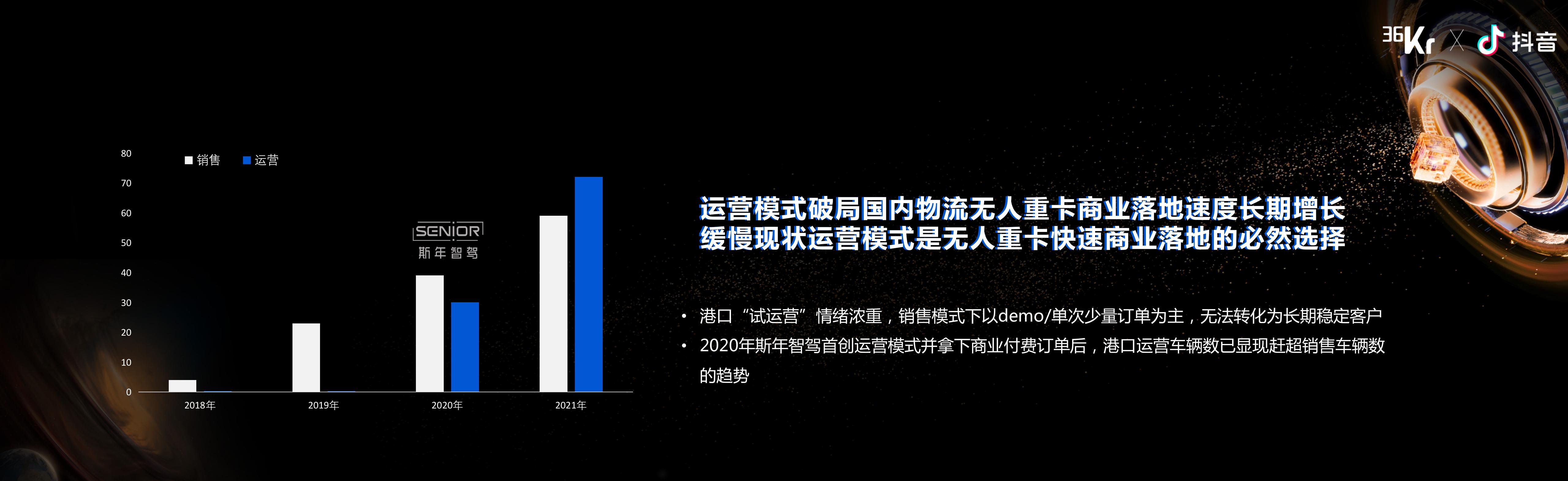 从结果导向而言,斯年成立的一年半时间里,去年全都在澐技术,实现了充分的积淀。今年我们花了半年时间,就完成了很多无人驾驶公司两年三年甚至四年干的事情,我们现在已经实现将近40辆车在两个港口实现了批量化的运营。而且在我们去年首次提出运营模式之后,可以看出,蓝色所代表的运营模式数量明显有反超传统销售模式的趋势。我们能够帮助物流重卡在港口完成更快速的落地。