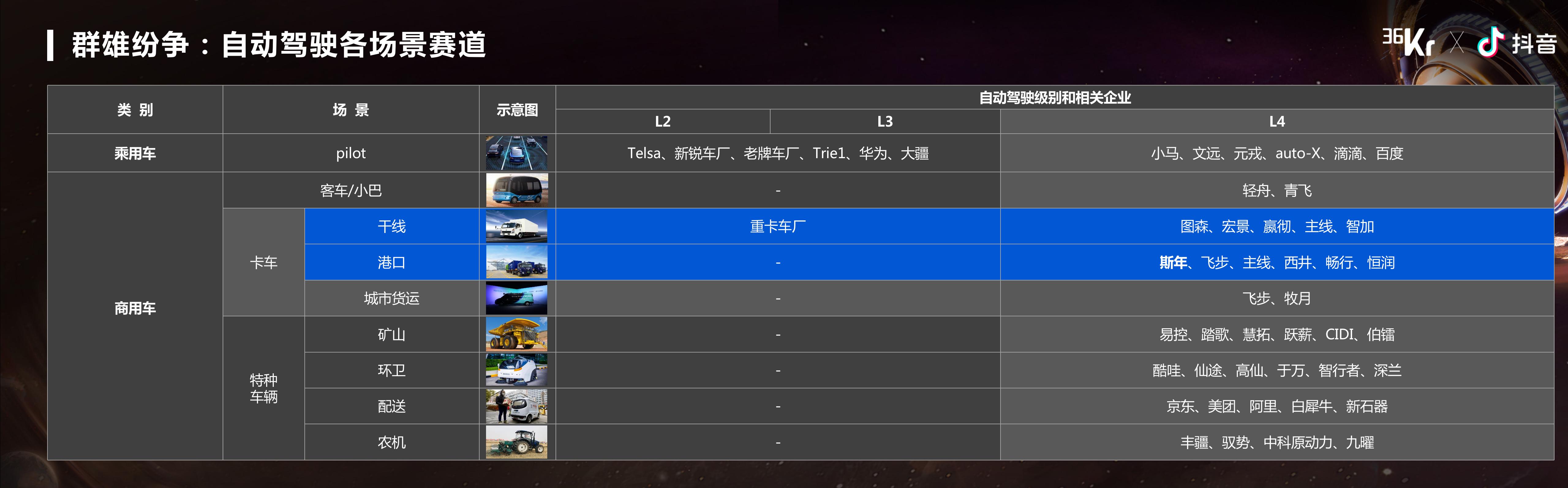 为什么会选择这个行业呢?作为一个标准的码农和工科生,我是用排除法在众多赛道中筛选出了最佳最快落地赛道。从2015年开始,我在百度开始做无人驾驶,基本上百花齐放、百家争鸣。如图所示,我们可以把所有无人驾驶公司均匀的放在这样一个表格里面。横轴是自动驾驶的等级,L2、L3、L4,纵轴就是很多的应用场景,可以做乘用车,也可以做商用车,公交、卡车、特种车辆都没有问题。每一个人都有自己的选择,都有自己的认知,所以我们斯年智驾更多的是聚焦在干线和港口这样两个赛道,去做L4级别的重卡无人驾驶。