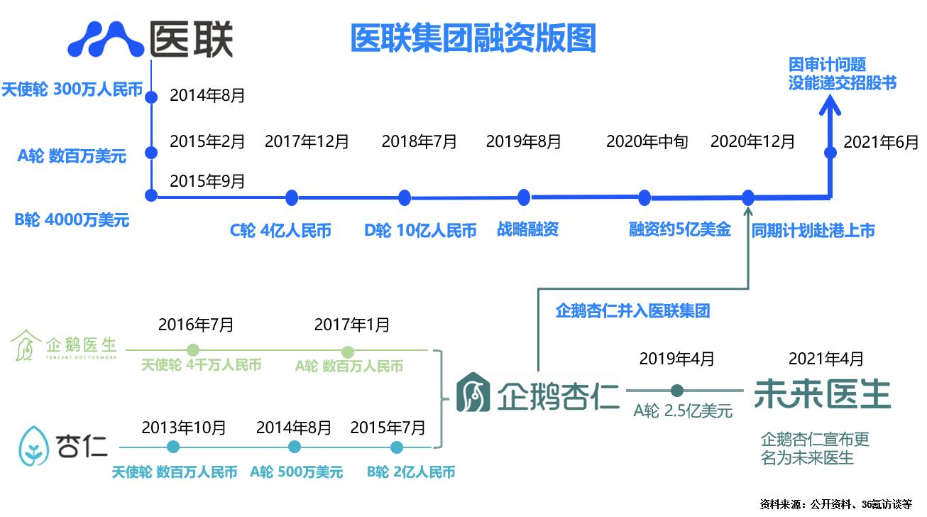 另外,根据公开信息,医联或将于2021年6月递交招股文件。近期,36氪从多个渠道处获悉,在2021年年中时,医联在筹备上市的过程中先后遇到“财务审计问题”和“IT审计问题”,没能提交招股文件。