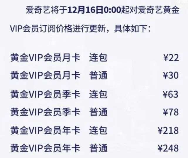 12月15日,据爱奇艺VIP会员官方消息显示,爱奇艺将于12月16日0:00起更新黄金VIP会员订阅价格,据悉 连续包月由19元上调至22元,连续季卡由58元上调至63元,普通月卡则由25元上调至30元,普通季卡由68元上调至78元,年卡会员费不变。同时,为此前已购买且尚未取消前述连续包月/包季/包年服务的用户提供一年保持原服务。