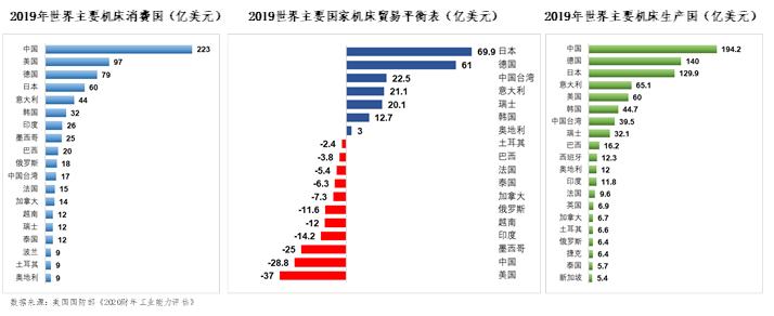上图是2019年世界各国机床贸易情况。中国美国同为最大的机床消费国,同时也是最大的贸易逆差国。最大的顺差国分别是日本、德国。