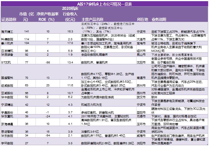 这是A股17家机床上市公司的情况。机床收入最高的秦川机床、海天精工,收入都没有超过20亿。