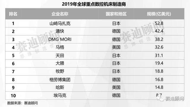 上图是赛迪顾问2019年全球重点数控机床规模表。最大的山崎马扎克,年收入52.8亿美元,折合335亿人民币,第5的日本天田,年收入31.1亿美元,接近人民币200亿。