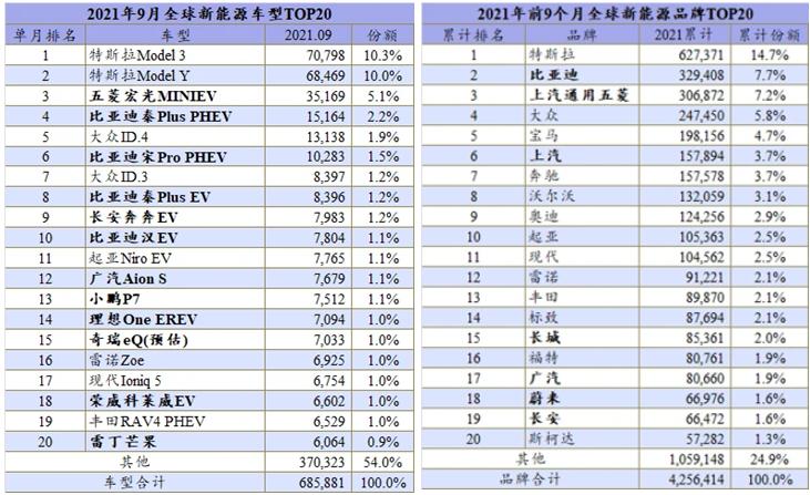 在2021年9月份全球新能源汽车车型销量前20榜中,中国有12个,除了比亚迪系列外,还有你平时听都没听过的雷丁芒果。哪怕按品牌计算,在全球前9个月的累计数据中,比亚迪也仅次于特斯拉排名第二。