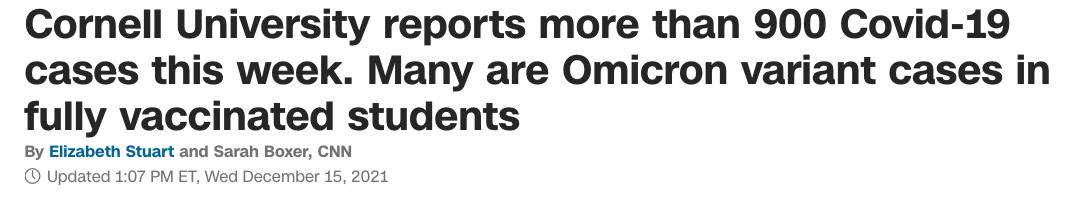 过去一个月美国不断爆发出新的Omicron变种案例,让已经抱有疫情快要结束幻想的美国人民再次感到威胁。本周,康奈尔大学一周内有超过900人确诊新冠,其中包含不少完全接种两针剂疫苗的学生感染Omicron。