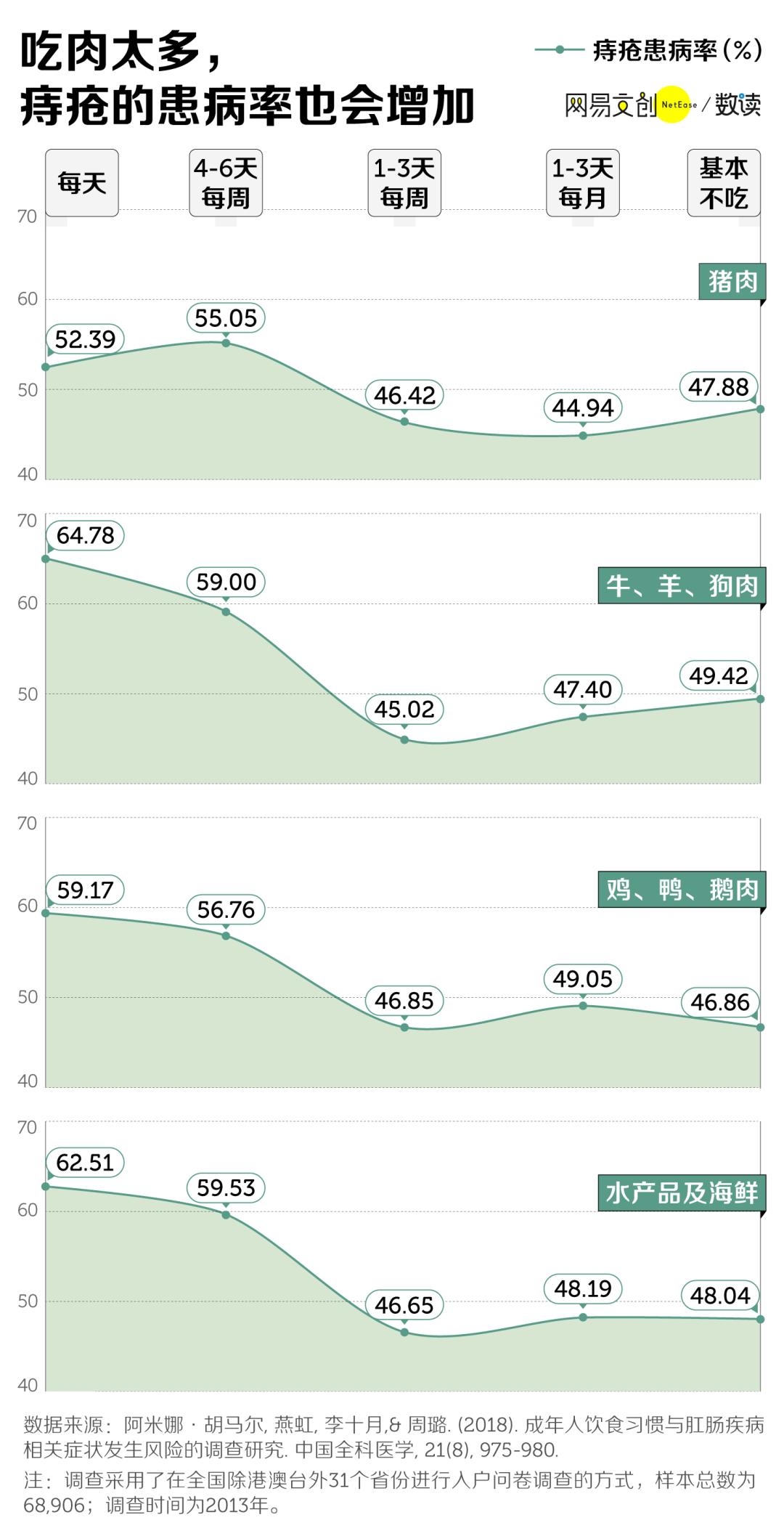 尤其是每天摄入牛羊肉和水产品的人群,相较于基本不摄入者,肛肠疾病的患病率最高增加了 14.5% [4]。