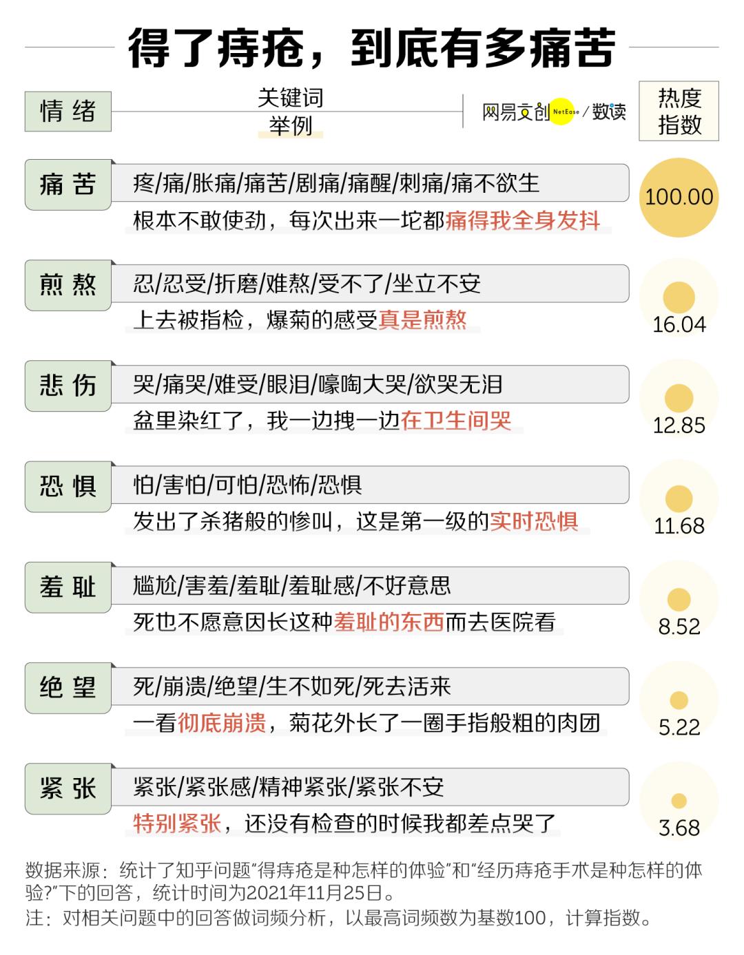 根据统计,在这 3000 多个痔疮故事中,仅是与“痛”相关的字眼就出现了 17223 次,热度指数位居榜首。
