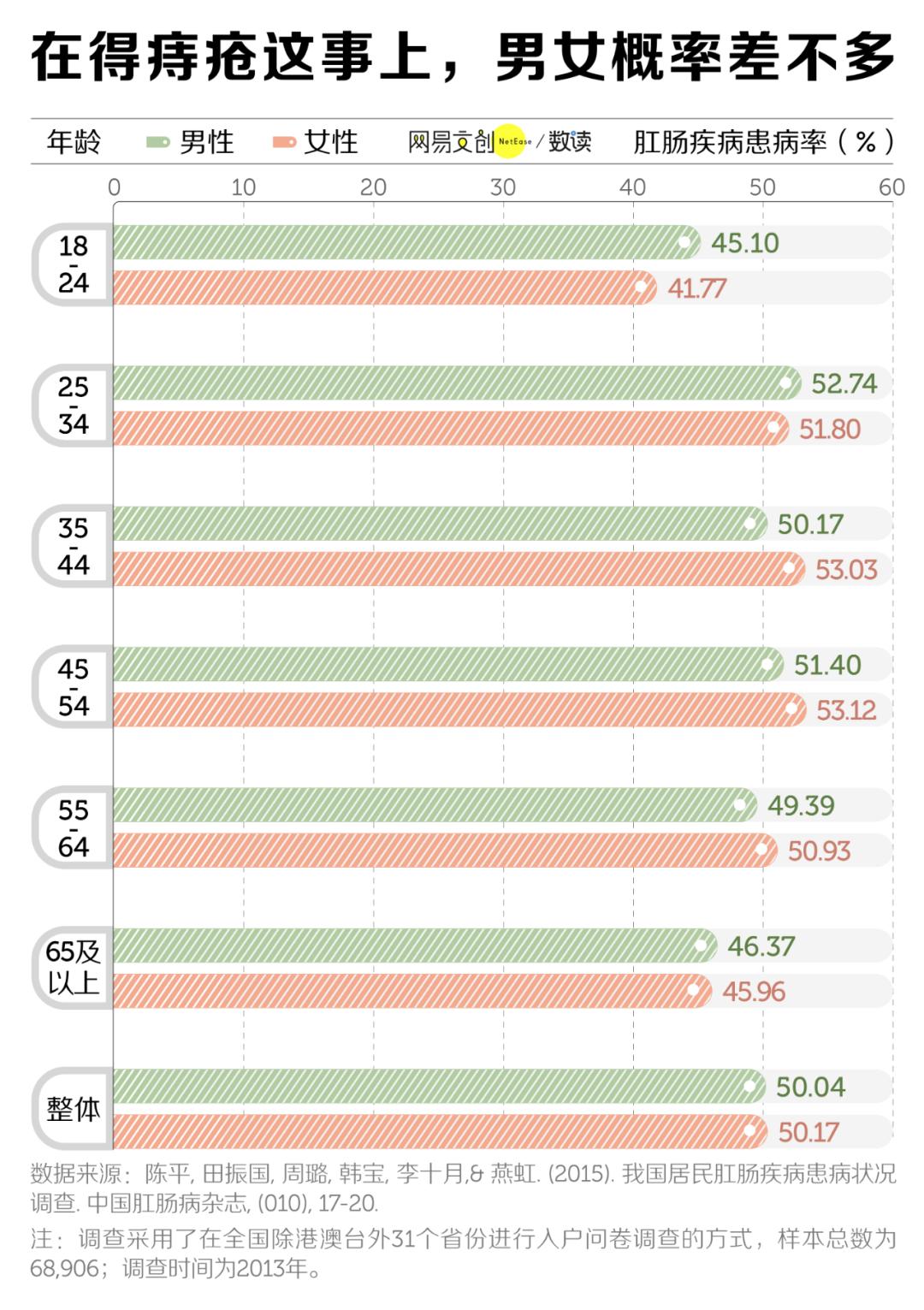 除此之外,老少之间也没有太过显著的差异。从 25 岁到 64 岁,每个年龄组的肛肠疾病患病率都稳定在 50% 左右 [2]。