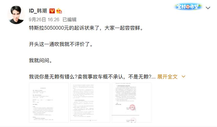 特斯拉起诉的车主之一就是韩潮。这位天津Model S车主自2019年以来一直在指控特斯拉欺诈,声称特斯拉将一辆经过大修的二手车卖给了他。韩潮在其微博上称特斯拉为“流氓公司”,并指控特斯拉向法庭撒谎。随后,特斯拉提起反诉,称韩潮发表了“未经证实、没有根据、诽谤性言论”,寻求500万元(约合78.5万美元)赔偿金和5万元的“合理费用”。