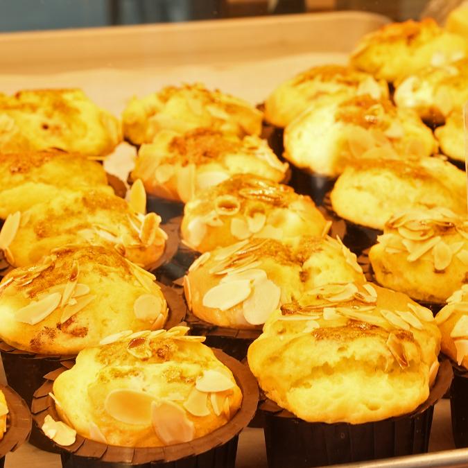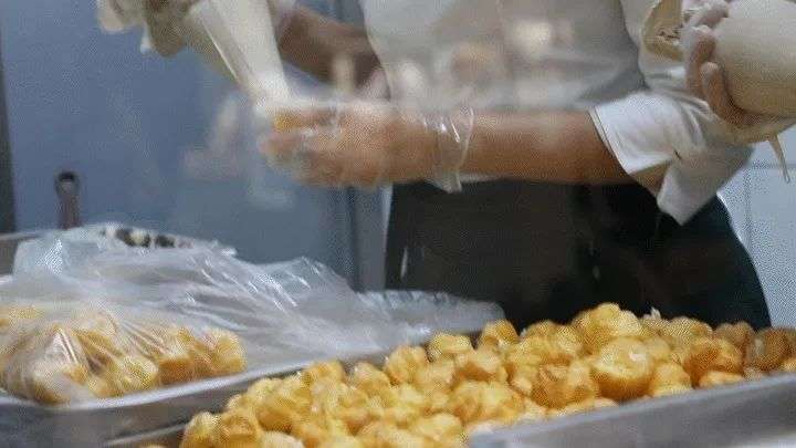 开放式厨房正前面的大玻璃窗可以看到店员正在手动给泡芙挤奶油。我细细观摩了一会,店员拿起泡芙壳一戳一挤一滚,节奏拿捏得刚刚好,看得我一时有点上头。