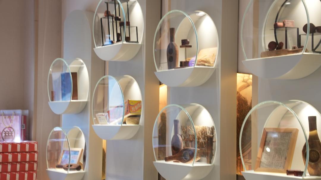 零号店店内面积其实比较小,仅有一间屋子大小。走进门正对着是复原之前稻香村老牌匾,一套放着枣花抱枕的桌椅供游客拍照打卡。