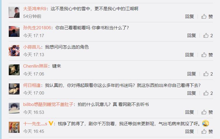 另一波观众则站在了剧组方考虑:“都按原作的武打场面拍的话,一场打戏占两集,经费太燃烧了。”