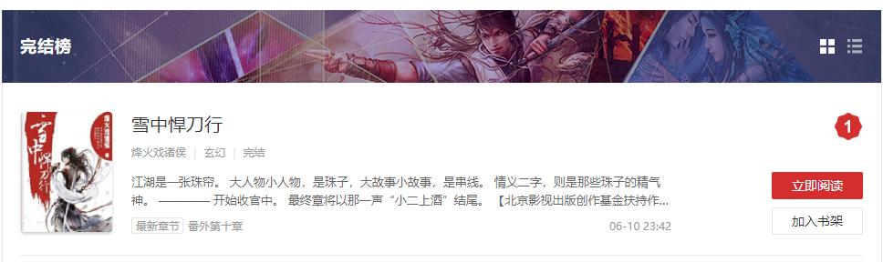 首先要说明的是,原作《雪中》在网文圈声名远扬。其修仙玄幻、江湖情仇的设定,以及“多女主”的情节也是男频文学经久不衰的流量密码。连载四年,常年霸榜,直至今日,还在其正版授权平台纵横小说网位列完结榜冠军。