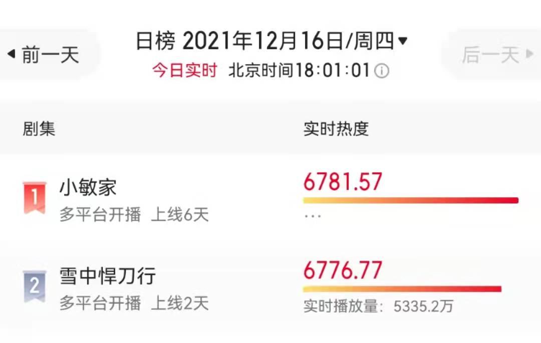 在一番吐槽声中,据猫眼专业版显示,新鲜开播的《雪中》也被五天前开播的《小敏家》压了一头,位列热度榜第二。而《雪中》在央八的收视从接档前的2.5跌到了0.8,相反,在湖南卫视播出的《小敏家》收视达到新高。