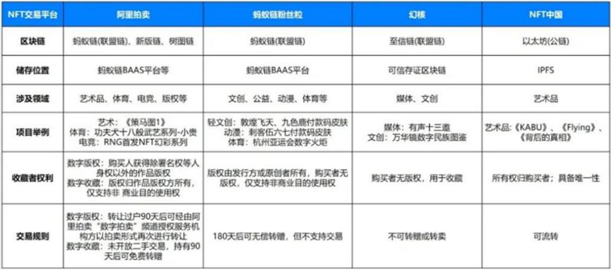 目前国内主流的NFT交易平台有:NFT中国、蚂蚁链粉丝粒、阿里拍卖和幻核。