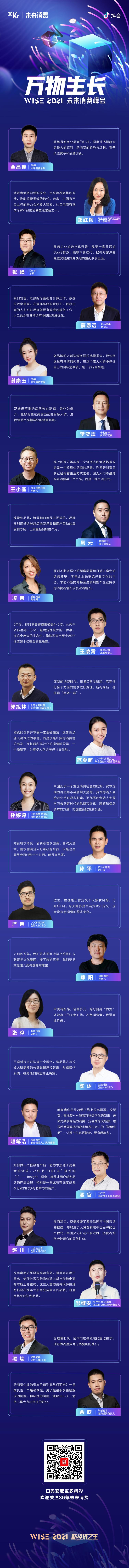 12月15日,36氪联合「未来消费」举办了主题为“万物生长”的「WISE2021未来消费峰会」,邀请二十余位消费零售行业大咖、业界精英、消费零售头部企业、顶级投资机构齐聚上海,站在2021年末,展望2022年消费零售行业新风向、新机遇。