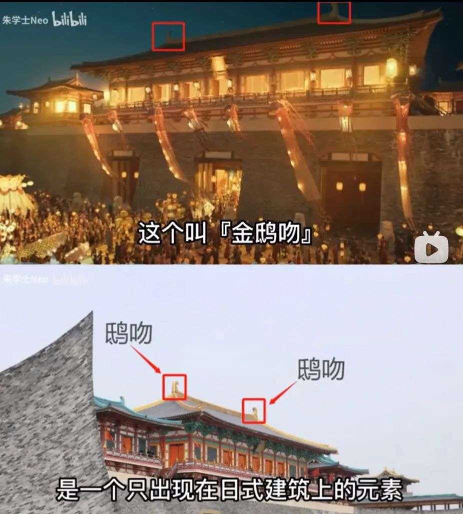 如此的质疑,时有出现。12月10日,专注研究汉服文化、古建筑文化的B站UP主@朱学士Neo发布视频,总结了该剧不合古制,“以倭代唐” 的点:开幕的日式灯笼就是开屏暴击;太初宫上的金鸱吻,是日本建筑近代以后的特色;男主服饰放量不足,而唐代服饰的放量是相对更为宽松的…… 目前,该视频在B站的播放量已破140万。