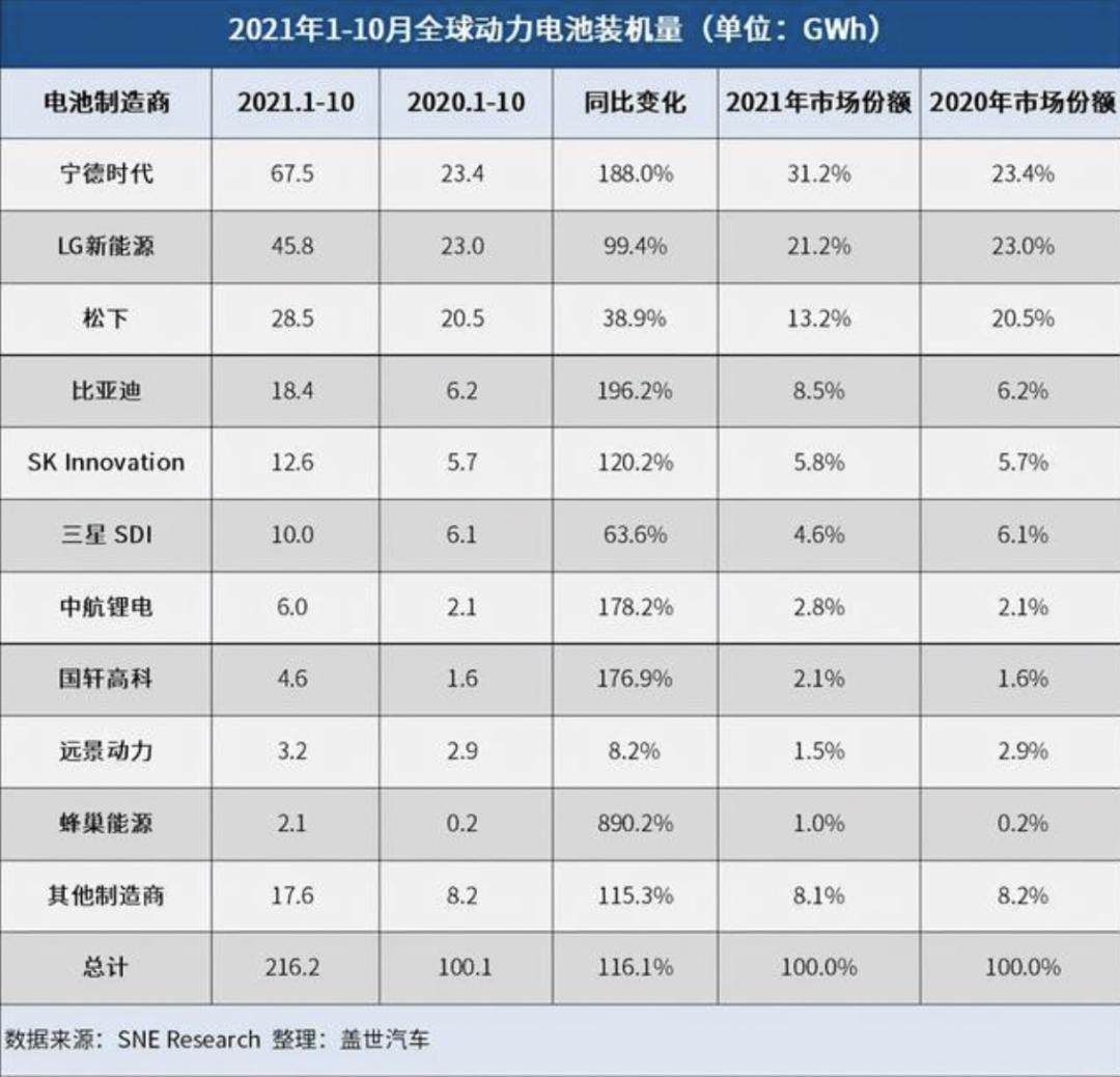 随着消费者对于电动汽车的接受度大幅提升,动力电池的全球需求也将保持快速增长。中国化学与物理电源行业协会秘书长刘彦龙认为,动力、储能电池需求的TWh时代会在2025年之前到来,国内外头部电池企业今年悉数进行了数百GWh的扩产。只不过,从市场份额的角度出发,“头重脚轻”的市场结构依旧没有得到改变。在今年前11个月的总装车量上,宁德时代以超过50%的市场份额上演了“以一敌九”的戏码。