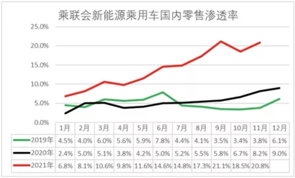 来自乘联会的数据显示,今年1-11月我国新能源汽车销量达到299万辆,同比增长166.8%,全年销量有望突破340万辆。前11个月新能源汽车国内零售市场渗透率已经达到13.9%,较2020年5.8%的渗透率提升明显。