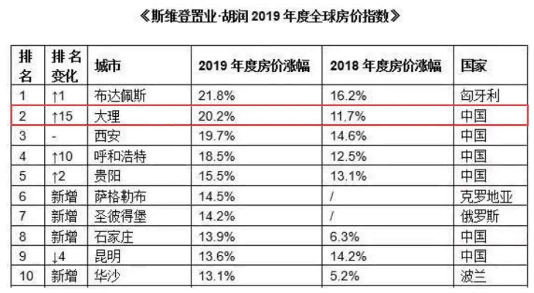 过去几年大理房价涨了有多少?胡润研究院发布的《胡润2019年度全球房价指数》报告显示,2018-2019年大理房价一年涨幅达20.2%,是中国房价涨幅最高、全球房价涨幅第二的城市。在这个榜 单上,昆明房价涨幅排在全国第6位、全球第9位。