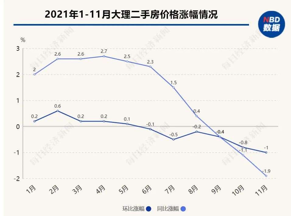 进入2021年,大理房价依然未能止住下跌态势。国家统计局数据显示,今年前11月,大理新房价格除了在3月有短暂上涨外,其他月份均处于下跌状态,甚至一度领跌全国70城。不仅如此,大理二手房价格也在今年下半年开始出现持续下跌,11月二手房价格下跌幅度达1.9%,创下年内最大跌幅。