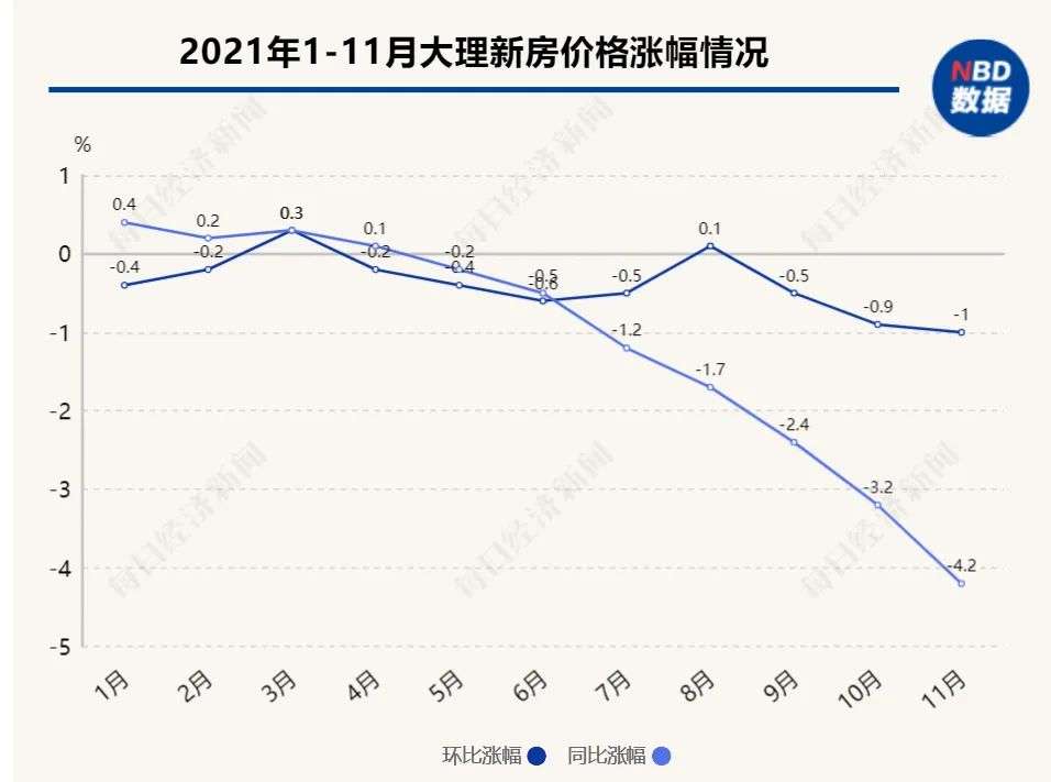 但自去年开始,大理新房价格由涨转跌。国家统计局数据显示,去年大理有3个月房价与前一个月持平,有4个月房价环比下跌,并从去年11月开始连续下跌,且房价降幅不断扩大。截至今年11月,大理房价同比下跌达4.2%。