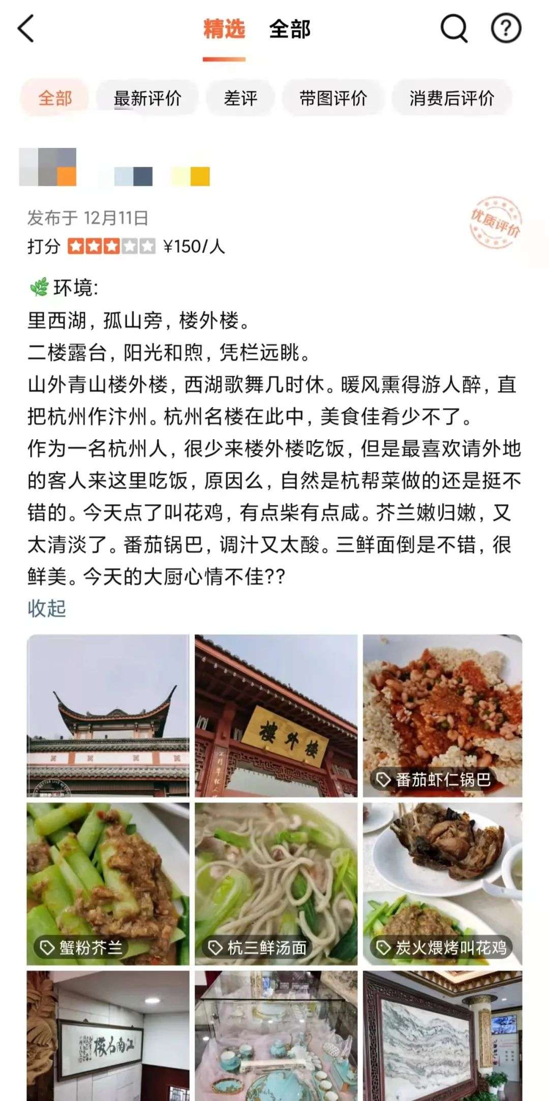 外地游客来了杭州,到了西湖,都会想去尝尝百年老字号“楼外楼”的菜肴。“一楼风月当酣饮,十里湖山豁醉眸”,这个从乾隆时期就声名远扬、接待过大量外宾、拥有深厚历史底蕴的国菜馆,常年挤满了来自全国各地的旅行团,但在各路美食平台上,却总能看到“难吃”“太贵”“不会再去第二次”这样的评价。