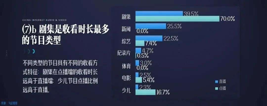 根据今年6月的《2021中国网络视听发展研究报告》,剧集是收看时长最多的长视频节目类型,尤其是点播端的占比超过70%,在长视频消费领域具有关键地位;报告也指出,四成00后观众选择倍速观看网络视听节目。