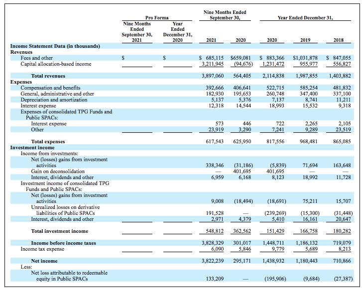 招股书提到,2018年、2019年、2020年及2021年截止9月30日,TPG的总收入分别为14.04亿美元、19.88亿美元、21.15亿美元及38.97亿美元,净利润分别为7.11亿美元、11.80亿美元、14.39亿美元及38.22亿美元。