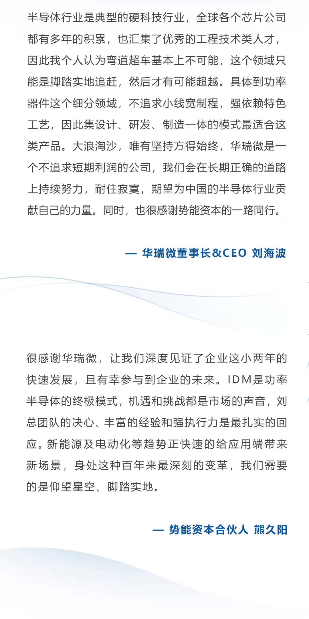 继2020年底完成2亿元A轮融资后,功率半导体企业华瑞微于近期连续完成了B轮和B+轮3亿元融资。此次参与的机构有产业投资方芯朋微、活水资本、万联广生、政府产业基金及势能资本等,老股东毅达资本、浦高产投持续加持,势能资本连续担任独家财务顾问。本轮融资将助力华瑞微积极推进功率器件国产化之路,加大在IGBT、SiC功率器件等方面的研发力度,加快提升产能,实现进一步发展。