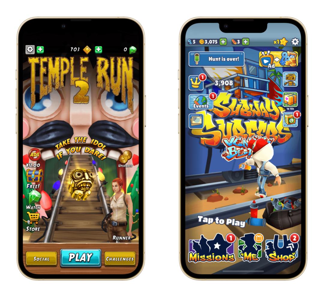 作为跑酷手游的「宗师级」产品,《地铁跑酷》来自于丹麦的 Kiloo 和 SYBO,而《神庙逃亡》则是出生在美国的 Imangi Studios。虽说这两个游戏之间的开发者们隔了一个大西洋,但核心玩法却出奇地一致。极为简单的操作,让人一上手就直呼过瘾,忍不住在游戏结束后一次又一次地点开重新开始,超越一个又一个自己创下的记录。