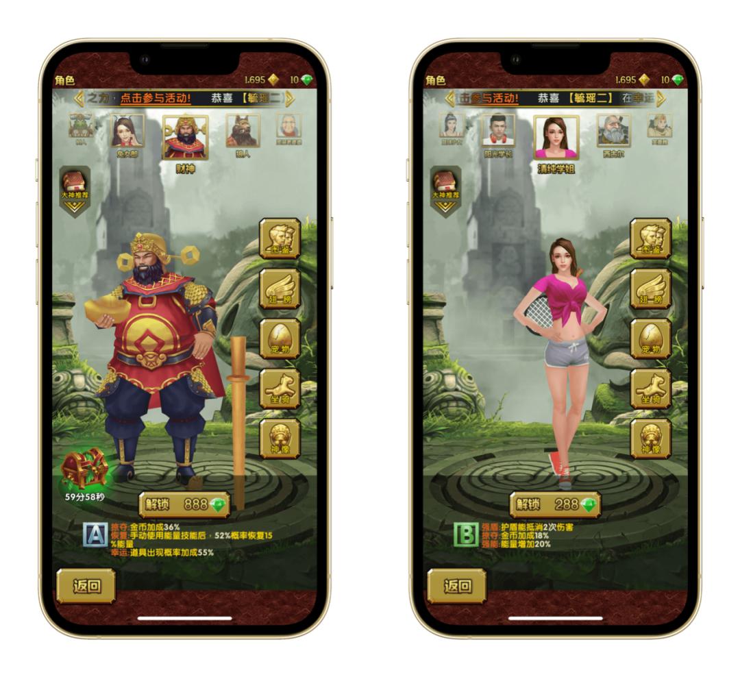 国区《地铁冲浪》中虽然也加入了奇奇怪怪的人物和装饰,但画风也还算符合这款游戏的整体视觉,好歹不会让人产生巨大不适。然而当我们来到《神庙逃亡 2》的皮肤和人物系统,被折服可就不止是双眼,还有我们的智商 —— 什么假面女王、杨戬、兔女郎、孙悟空,甚至还有……清纯学姐。