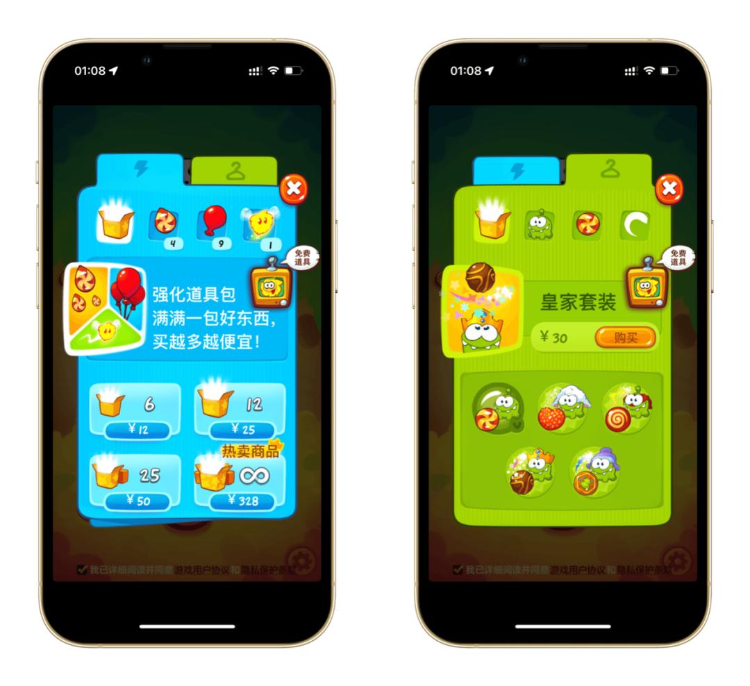 接下来就是最令我感到震惊的事情了,我本以为《割绳子 2》也会和被国内代理的不少游戏一样被无下限魔改,但实际上游戏的内购也仅限于提前解锁关卡或购买道具和装饰性的内容,完全没有《神庙逃亡 2》和《地铁冲浪》那么多令人智熄的魔改。最最重要的是,除非你主动点击观看广告获得免费道具之外,就算你没有付费购买任何项目,全程也不会有广告来打扰你的游戏。